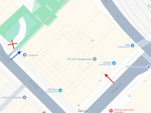 The red arrow is the main 2 Folsom building entrance. The blue arrow is the entrance to the parking garage, right past a small road. The red X indicates another parking garage entrance that is NOT Gap Inc. The parking garage elevators will bring you to the lobby.